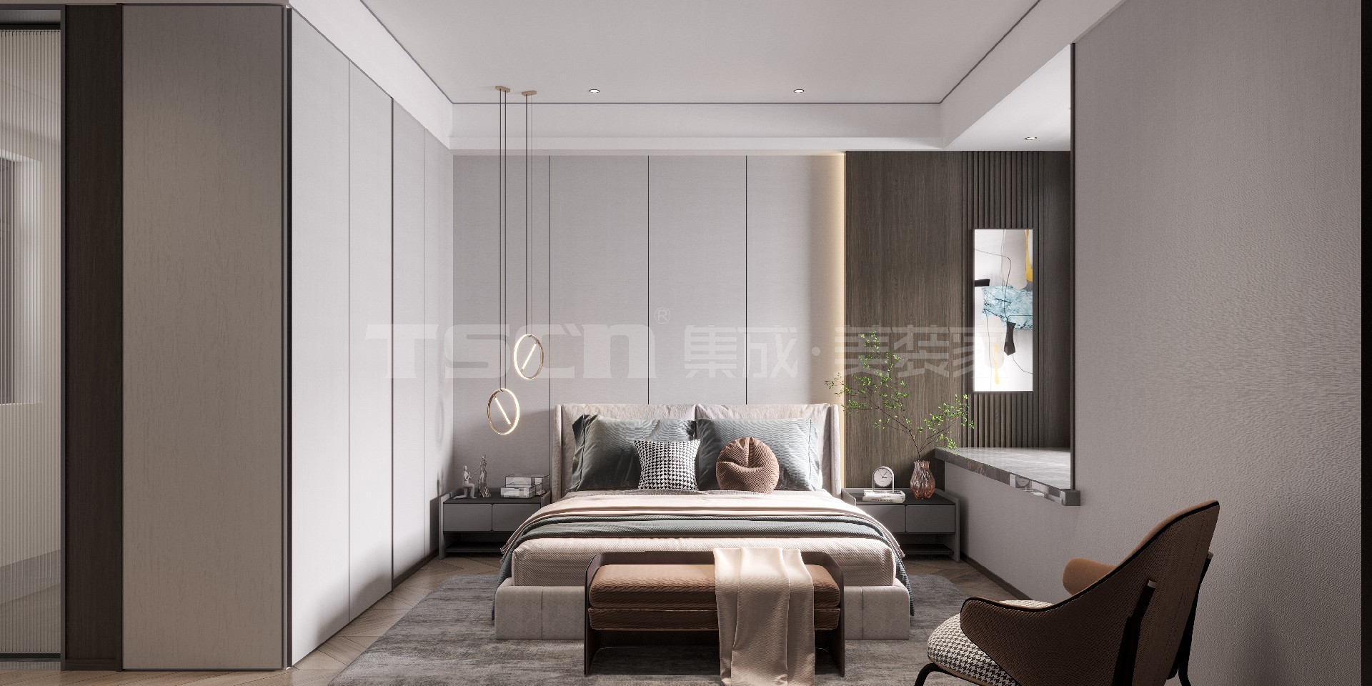 現(xiàn)代極簡風(fēng)格——本案以淺中性色為主色調(diào),輔以灰調(diào)煙熏木色,深淺對(duì)比,明暗有度。極簡風(fēng)格設(shè)計(jì)主張少而實(shí)用,從風(fēng)格設(shè)計(jì)到家具選擇整套流程皆遵循功能性原則,利用簡單的布局,極具格調(diào)的細(xì)節(jié)修飾,簡單卻又不匱乏地滿足了人們?nèi)粘;顒?dòng)所需。